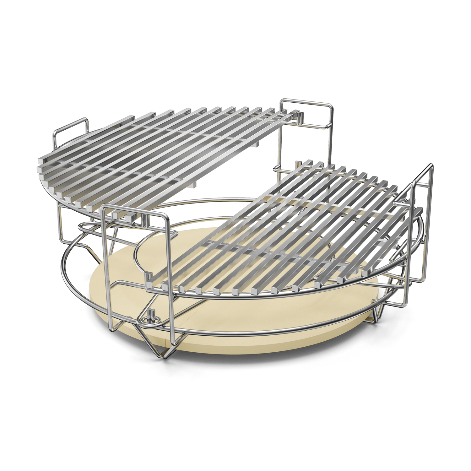 Półksiężycowe ruszty dzielą palenisko grilla Köler Kamado EG21 na dwie równe części. To znaczy, że mogą spocząć na tym samym poziomie albo na różnych wysokościach. Opiekaj silnie bliżej rozpalonych węgli lub korzystaj z siły gorącego powietrza unoszącego się wyżej.