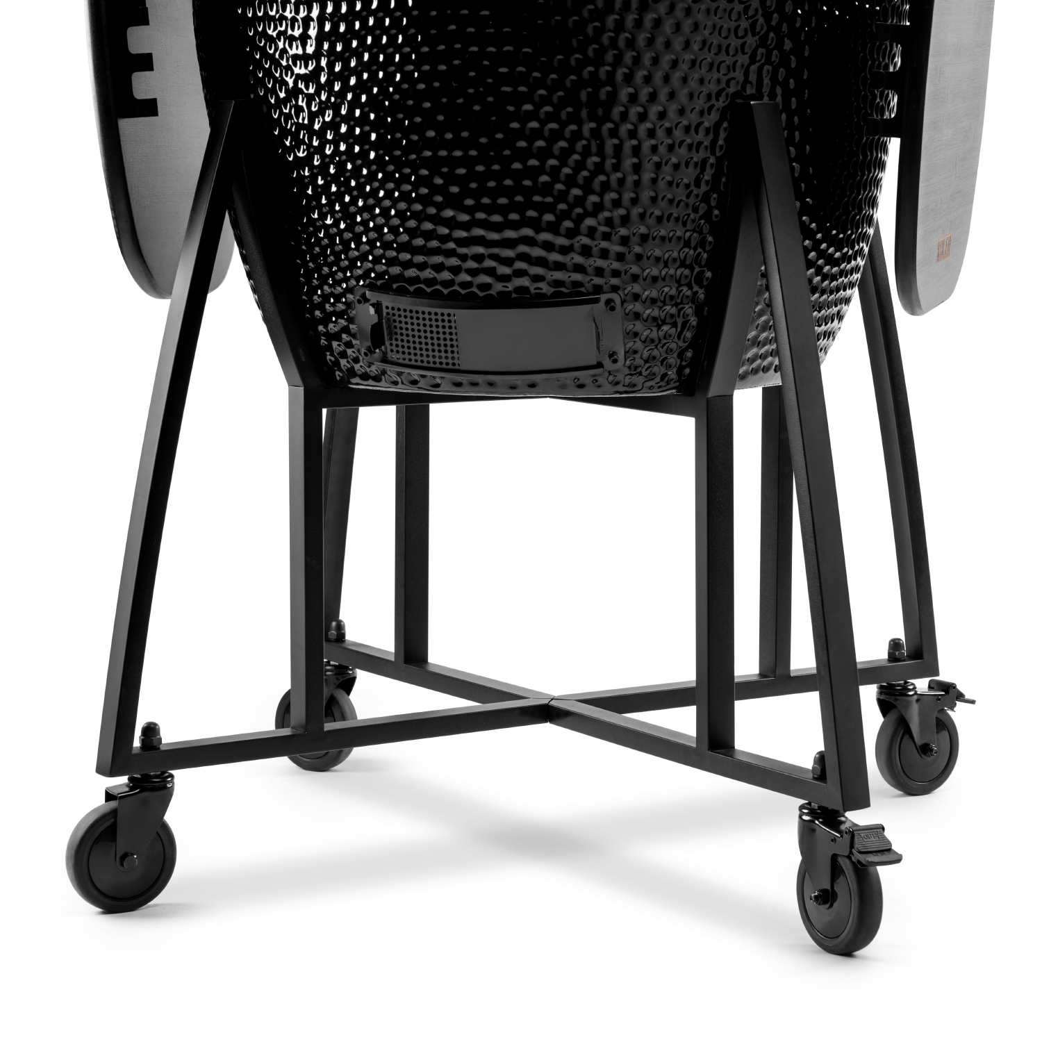 Masywny grill wymaga stabilnej podstawy. Zapewnia ją wózek wykonany ze stali nierdzewnej osadzony na czterech skrętnych kołach. Choć wózek dźwiga pokaźny kocioł, gładko sunie po płytkach, deskach tarasowych i betonie. A gdy już dotrze na miejsce, użyj dwóch hamulców, by zatrzymać całość w miejscu. Czarna powierzchnia doskonale współgra z błyszczącą czernią grilla. Razem tworzą miłą dla oka kompozycję.