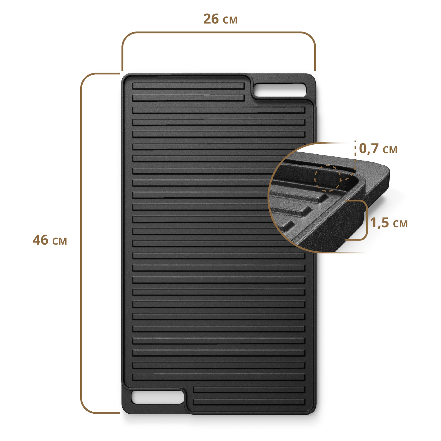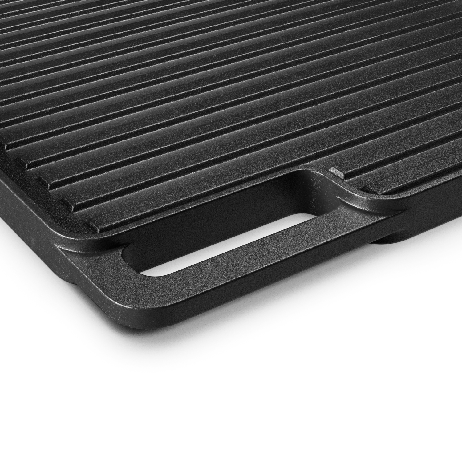 Dwa mocne uchwyty zapewniają pewny chwyt i bezpieczne przenoszenie, nawet gdy płyta jest rozgrzana. Po skończonym grillowaniu możesz ją powiesić na haczyku, by była zawsze pod ręką. Dodatkowy rant ochronny zabezpiecza przed wylewaniem się tłuszczu i sosów, dbając o porządek wokół stanowiska.