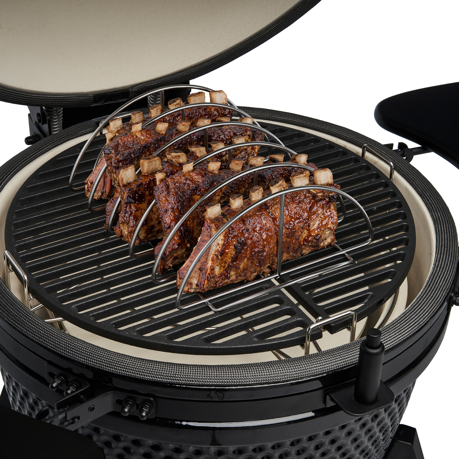 Specjalne przegródki oddzielają kawałki mięsa, dzięki czemu nic się nie skleja i nie przywiera. Chwycisz je wygodnie za koniec – bez szarpania i rwania włókien. A po zdjęciu z grilla stojak możesz po prostu postawić na stole – prezentuje się efektownie i zachęca do uczty.