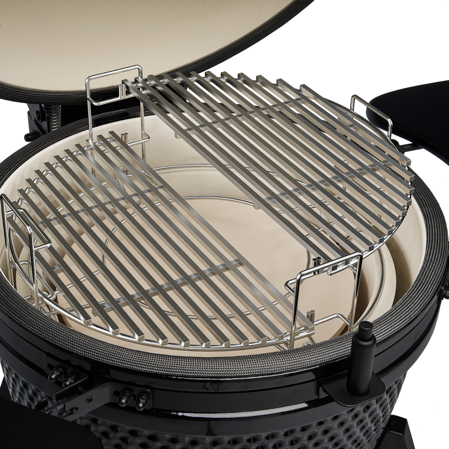 W zestawie znajdziesz także dwuczęściowy deflektor wykonany z kordierytu – materiału znanego z doskonałego rozpraszania i stabilizacji ciepła. To właśnie on umożliwia stworzenie w grillu strefy pośredniego ciepła, idealnej do powolnego pieczenia metodą low & slow, wędzenia czy przygotowania dań, które nie lubią bezpośredniego kontaktu z ogniem.