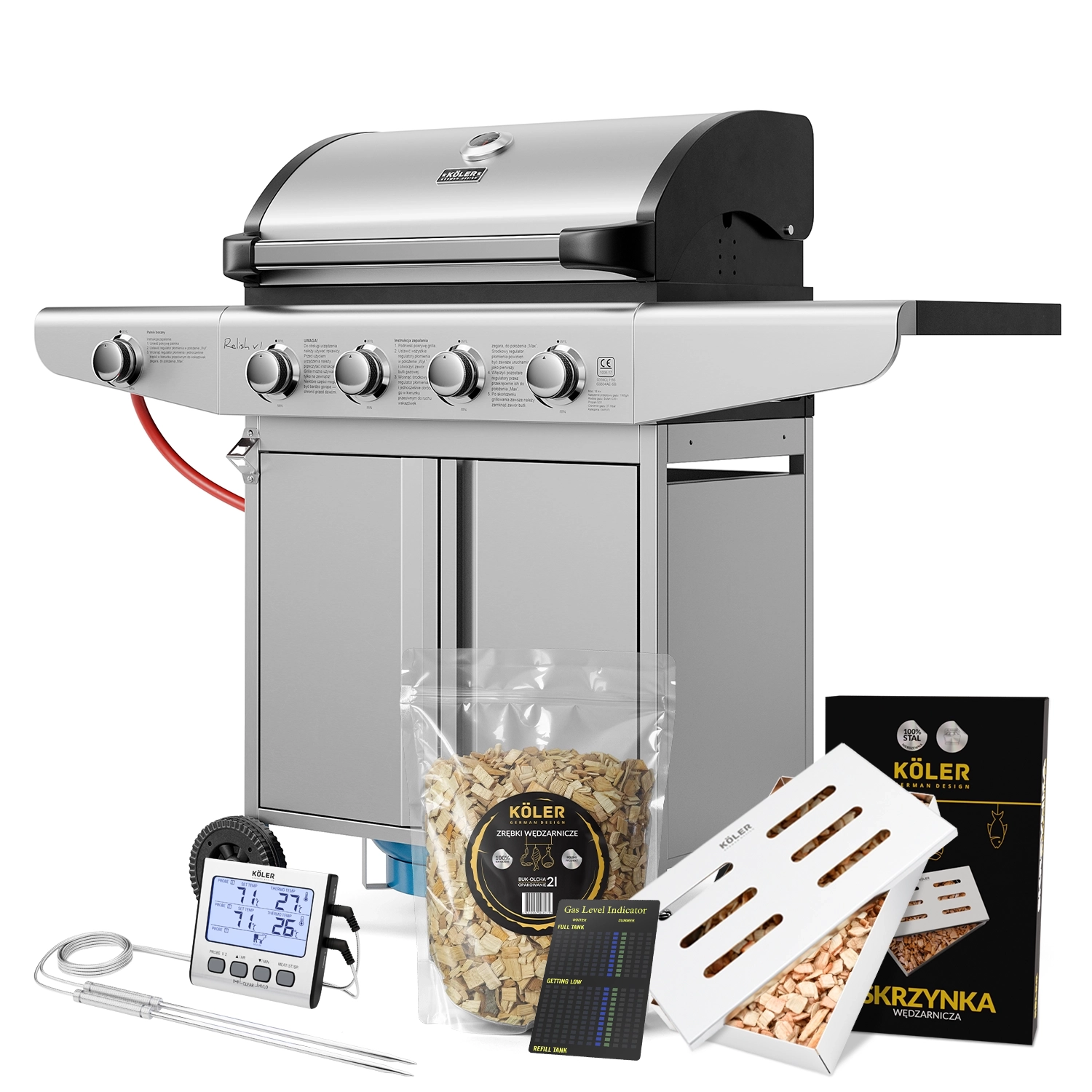 Grille gazowe Köler oferują niezawodność i komfort użytkowania, zapewniając długotrwałość na lata. Dzięki nim bez wysiłku przygotujesz zdrowe i smaczne posiłki. Ich solidna i łatwa w obsłudze konstrukcja gwarantuje długotrwałe zadowolenie. Jeśli szukasz sprzętu do grillowania i wędzenia, Zestaw Köler Relish V1 Standard zapewni Ci wszystkie niezbędne akcesoria do tworzenia pysznych potraw. Wysokiej jakości wykonanie oraz dodatkowe elementy, takie jak skrzynka wędzarnicza, zrębki BUK-OLCHA, termometr z sondą i wskaźnik poziomu gazu, sprawiają, że korzystanie z niego to czysta przyjemność.