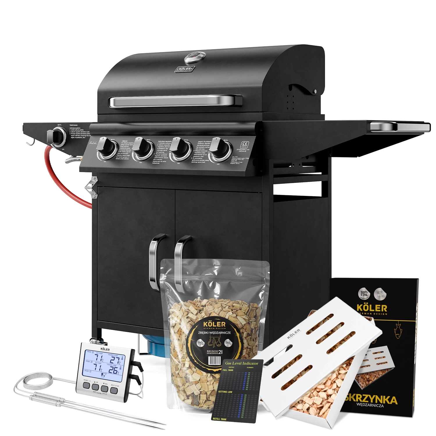 Zestaw Köler Relish V2 Standard to idealne rozwiązanie dla entuzjastów grillowania i wędzenia, oferujące wszystko, co potrzebne do przygotowywania smacznych potraw. Dzięki trwałej konstrukcji grilla, skrzynce wędzarniczej, wskaźnikowi poziomu gazu oraz zrębkom wędzarniczym BUK-OLCHA, możesz delektować się niepowtarzalnym smakiem swoich dań, a termometr z sondą pozwoli na precyzyjne monitorowanie temperatury podczas grillowania.